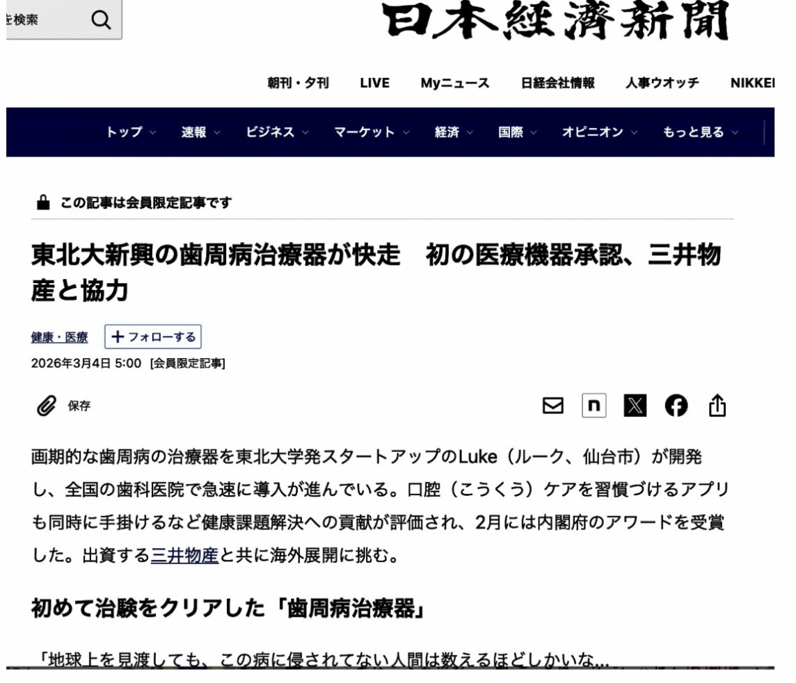 東北大学発スタートアップのLuke株式会社が開発した歯周病治療機器が医療機器として承認され、今後さらなる普及が期待されています。